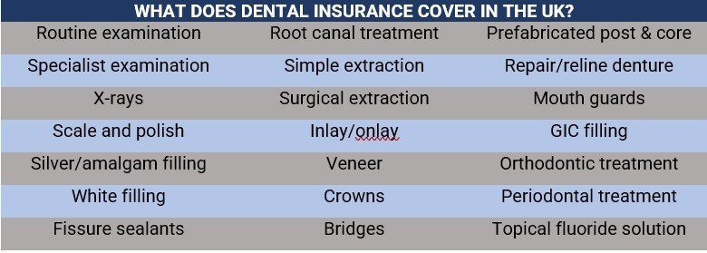 - The following table details the common procedures and treatments covered by private dental insurance policies in the United Kingdom.