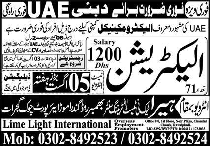 In a job posting from the Daily Express Newspaper, LIMELIGHT INTERNATIONAL is looking for an electrician in Dubai, UAE, and Dubai. Needed to have a DAE, Matric, Intermediate, etc., among other things. New Overseas Labor jobs from LIMELIGHT INTERNATIONAL and other jobs can be applied for until or until the closing date in the newspaper ad. Read the full ad online to find out how to apply for the latest jobs at LIMELIGHT INTERNATIONAL. There may be help with things like transportation, housing, and medical care.